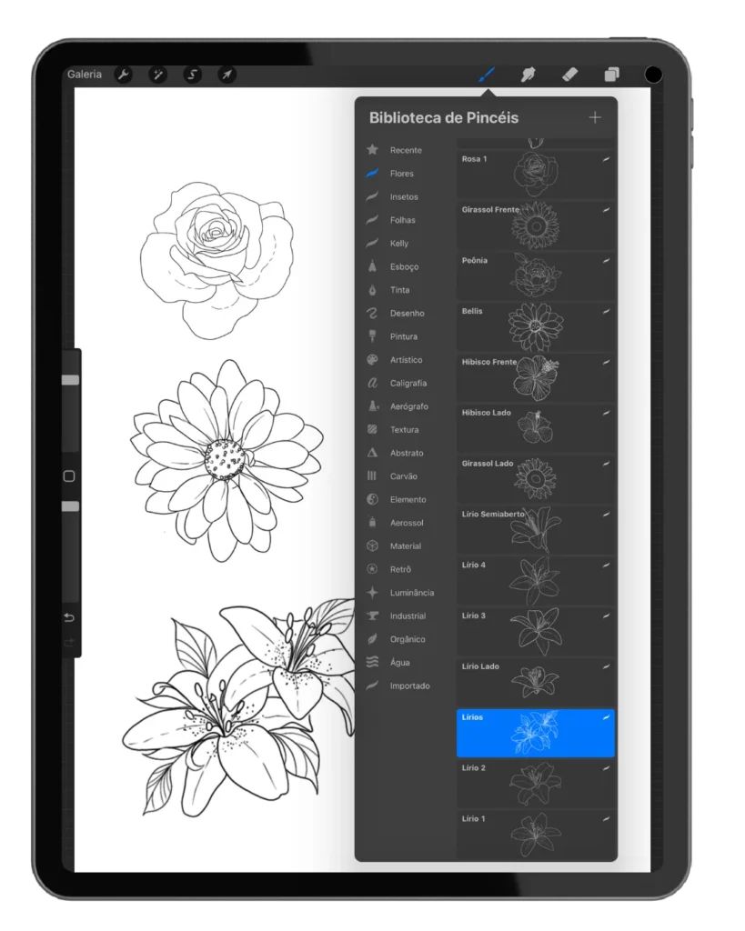 Aqui você vai encontrar uma biblioteca de pincéis de flores, folhas e insetos prontos, para treinar e criar suas primeiras composições no aplicativo Procreate, ou poderá fazer o download do PDF caso trabalhe com outros aplicativos de desenho.
