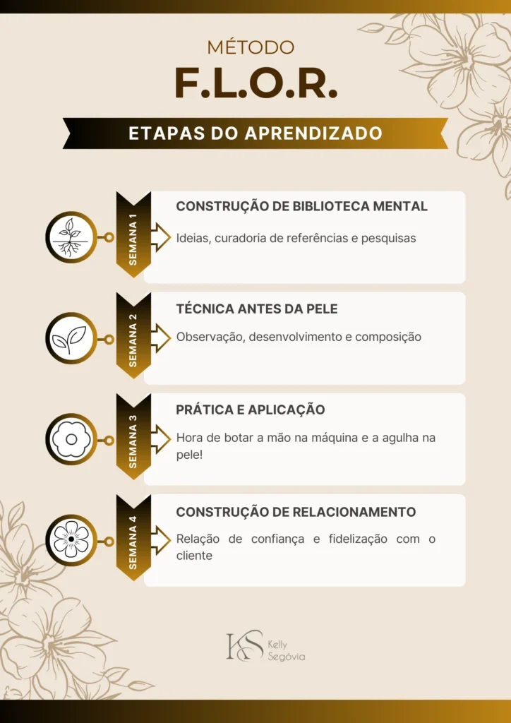 Criadora do Método FLOR, um treinamento completo que ensina passo a passo como criar tatuagens florais delicadas, harmônicas e autorais capazes de encantar clientes e serem valorizadas a cada por projeto.